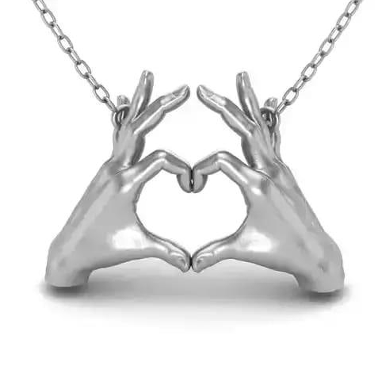 Crafted as two sculpted hands forming a perfect heart, this artistic pendant captures the