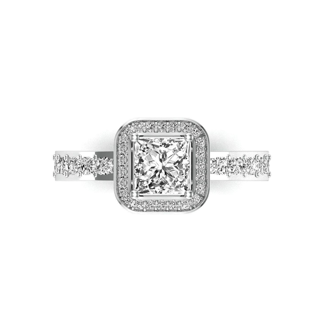 This princess-cut design is wrapped in a soft halo with a pavé-set band, giving it a refined